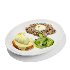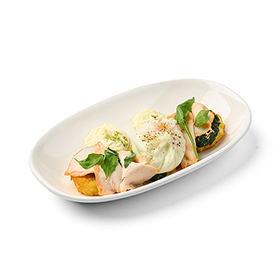 НовинкаДраник с яйцом пашот и сливочной гречневой кашей с муссом из пармезана и лимонным соусом бешамель