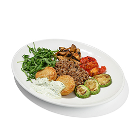 Гречневая каша с рулетом из индейки, яйцом пашот и муссом из пармезана